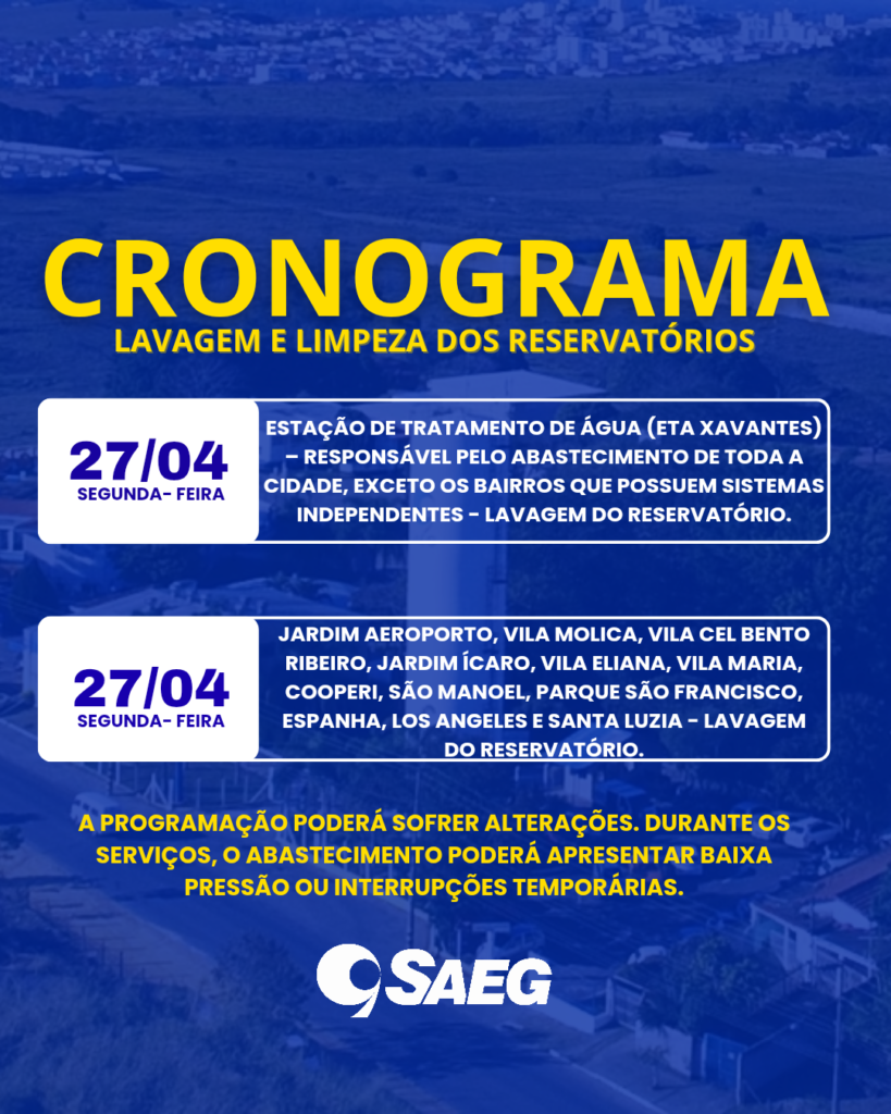 A SAEG informa que equipes técnicas trabalham, neste sábado (04), no reparo do quadro elétrico do Reservatório Mantiqueira.