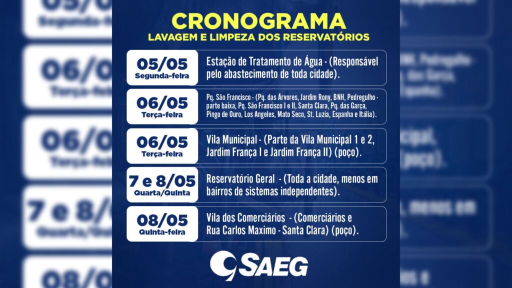 A SAEG (Companhia de Serviços de Água, Esgoto e Resíduos de Guaratinguetá) dará continuidade nas próximas semanas a limpeza e desinfecção dos reservatórios de água da cidade.